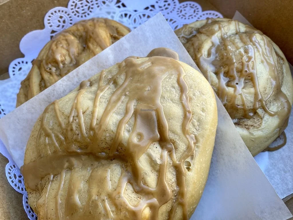 Vegan baked goods include Maple Cinnamon Rolls, a variety of giant cookies like Snickerdoodle, Oat Raisin, and even some gluten-free/vegan cookies! Other vegan baked goods include Banana Bread, Pumpkin Muffins, and Lemon Poppy Bites. They also serve coffee drinks.