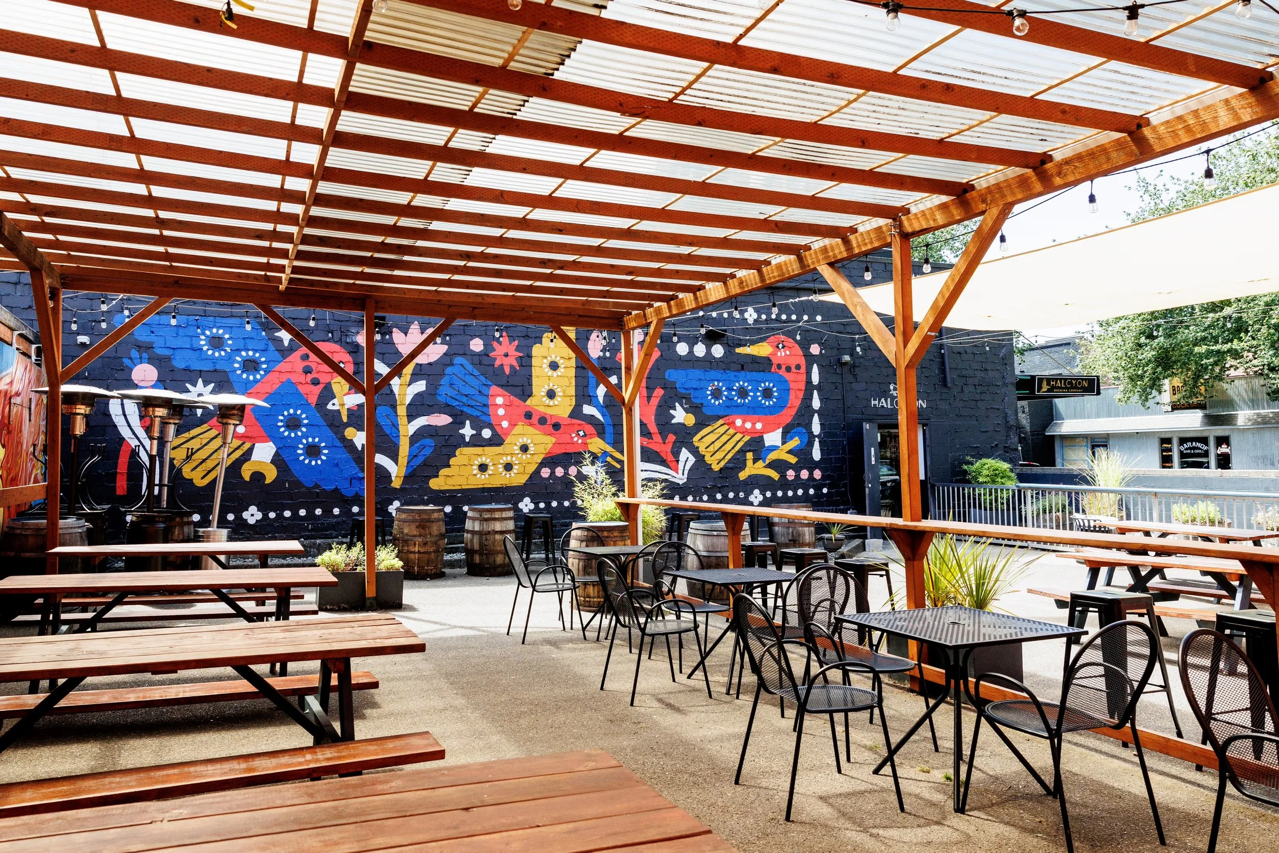 This family-friendly brewery has lots of indoor seating plus tons of patio tables. And in recent years they’ve changed their menu and added tons of vegan options! Enjoy twice fried fries, edamame, miso cucumber salad, ginger sesame tofu bites, and crispy Brussels sprouts!